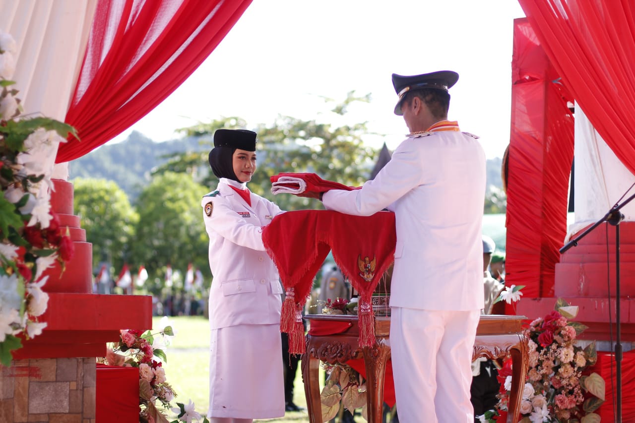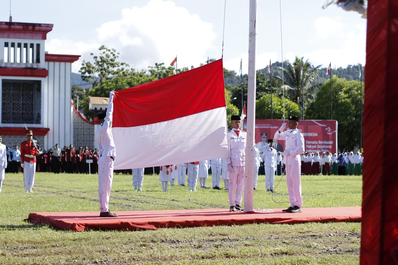 Momentum bersejarah ini diawali dengan pengibaran Sang Saka Merah Putih oleh Pasukan Pengibar Bendera Pusaka (Paskibraka) yang merupakan putra-putri terbaik Bolsel.