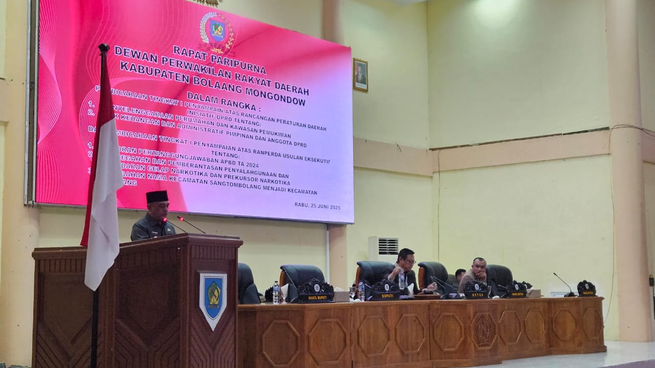 KILAS24,BOLMONG – Dewan Perwakilan Rakyat Daerah (DPRD) Kabupaten Bolaang Mongondow (Bolmong), menggelar rapat paripurna pembicaraan tingkat I terhadap sejumlah Rancangan Peraturan Daerah (Ranperda) pada Rab, (25/06).