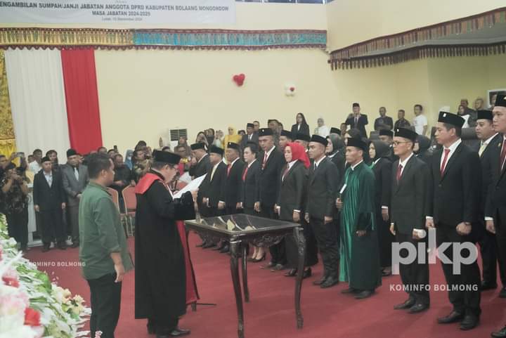 KILAS24,BOLMONG – Penjabat (Pj) Bupati dr. Jusnan C Mokoginta, menghadiri pelantikan dan pengambilan sumpah janji 30 anggota DPRD Kabupaten Bolaang Mongondow (Bolmong), Selasa (10/09).