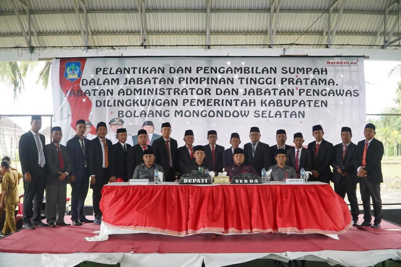 KILAS24,BOLSEL – Sebanyak 83 Pejabat Pimpinan Tinggi Pratama, Administrator dan Pengawas di Lingkungan Pemerintah Kabupaten (Pemkab) Bolaang Mongondow Selatan (Bolsel) resmi dilantik sekaligus diambil sumpah.
