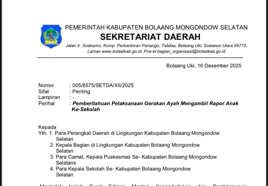 Melalui edaran tersebut, Pemkab Bolsel menginstruksikan seluruh perangkat daerah, kecamatan, puskesmas, serta satuan pendidikan di wilayah Kabupaten Bolsel untuk melaksanakan Gerakan Ayah Mengambil Rapor Anak ke Sekolah.